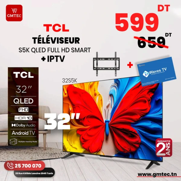 Téléviseur TCL 32S5K – 32’’ QLED FHD – Google TV – Dolby Audio