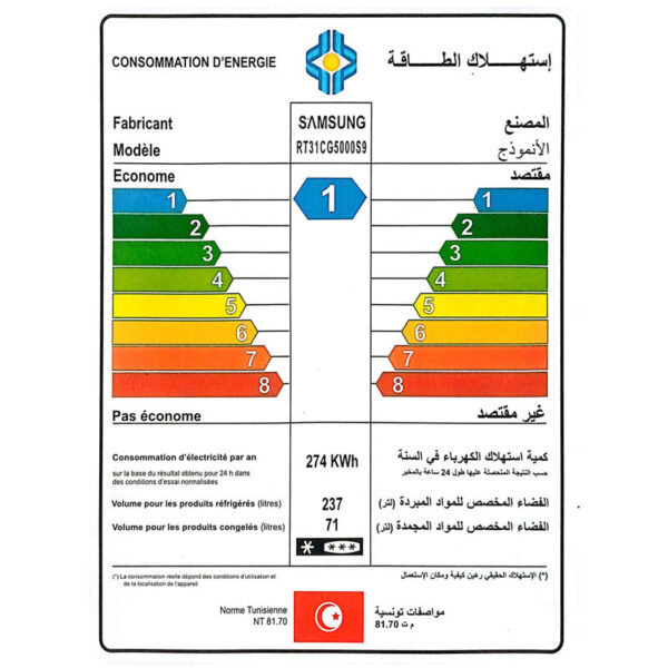 - Le Réfrigérateur SAMSUNG combine élégance et performance avec son design 2 Portes et son système de refroidissement NoFrost pour éviter la formation de givre. Il dispose d’un volume net de 305 litres, réparti entre un réfrigérateur de 237 L et un congélateur de 68 L. Sa classe énergétique A+++ assure une consommation réduite, tandis que son compresseur à onduleur numérique garantit efficacité et silence. Équipé d’un éclairage LED, d’un système désodorisant, de la technologie Multiflux et d’étagères en verre trempé, il maintient une zone fraîche optimale. Profitez également d’une machine à glaçons torsadés. Dimensions : 171,5 x 60 x 64,7 cm. Couleur : Inox. Garantie : 2 ans + 20 ans sur moteur.