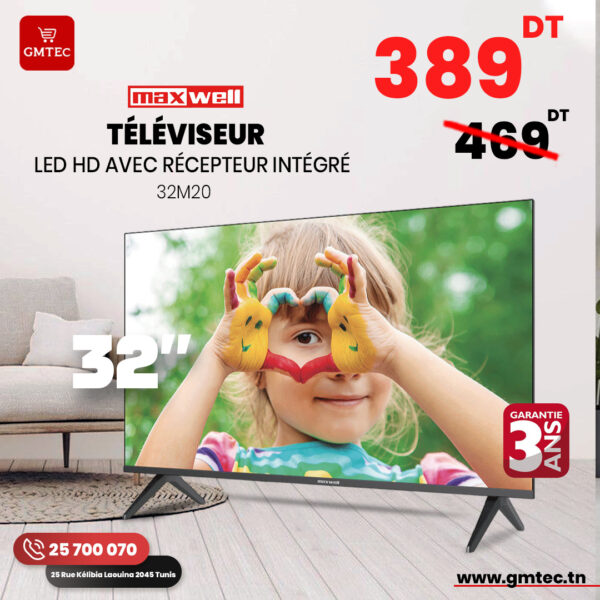 Téléviseur MAXWELL – M20 / Taille : 32 Pouce / Résolution : HD (1366×768 Pixels) / Avec Récepteur Intégré / Sortie Audio : 2×8Watt / Avec Audio Dolby / Bordure Frameless / Connecteurs : 3x HDMI – 2x USB – 1x AV IN – 1x DVB_S/S2 – 1x DVB_T/T2 – 1x COAXIAL / Dimensions : 732 x 434 x 81.8 mm / Poids : 3.5 kg / Garantie 3 ans.