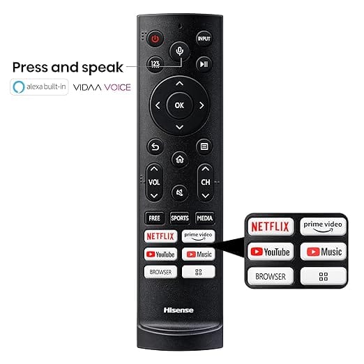 Fonctionnalité : Fréquence de rafraîchissement élevée de 240 Hz | Technologie de gradation locale avec 256 zones de gradation locale | 2.1 canaux | Fils WiSA | Mise à l’échelle 4K par IA | MEMC | HDR 10+ adaptatif | Dolby Vision QI | Mode jeu PRO 144 Hz | AMD FreeSync Premium | Alexa intégrée | Vidaa Voix intégrée | Applications compatibles : Netflix, YouTube, Prime Video, Disney+Hotstar, SonyLiv, Hungama, JioCinema, Zee5, Eros Now