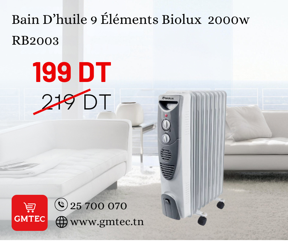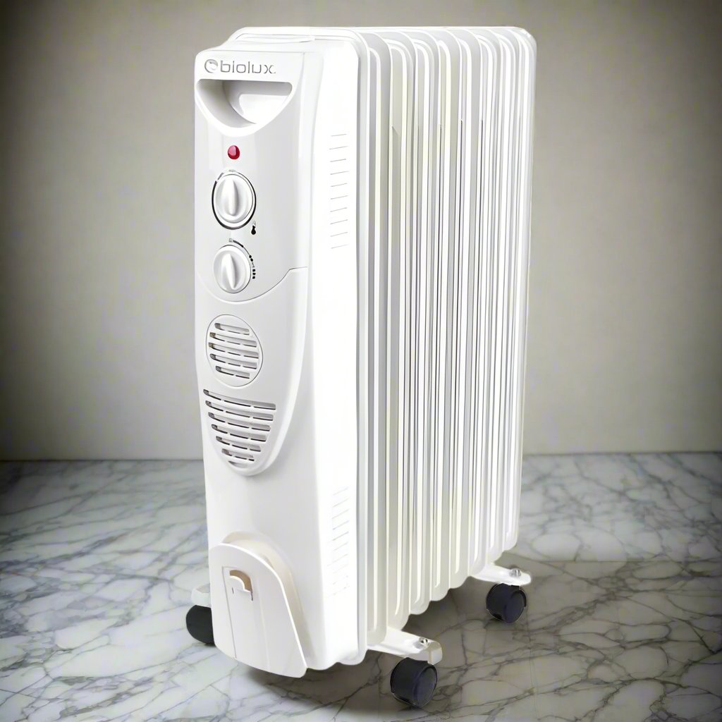 Radiateur Bain d’Huile BIOLUX - Puissance: 2000 Watts - Nombre d'Éléments: 9 éléments radiants - Thermostat réglable - Protection de surchauffe - Interrupteur avec indicateur lumineux - Roulette souple pour mouvement facile - Cache cable - Dimensions: 44 x 16 x 64.5 cm - Couleur: Blanc - Garantie: 1 an