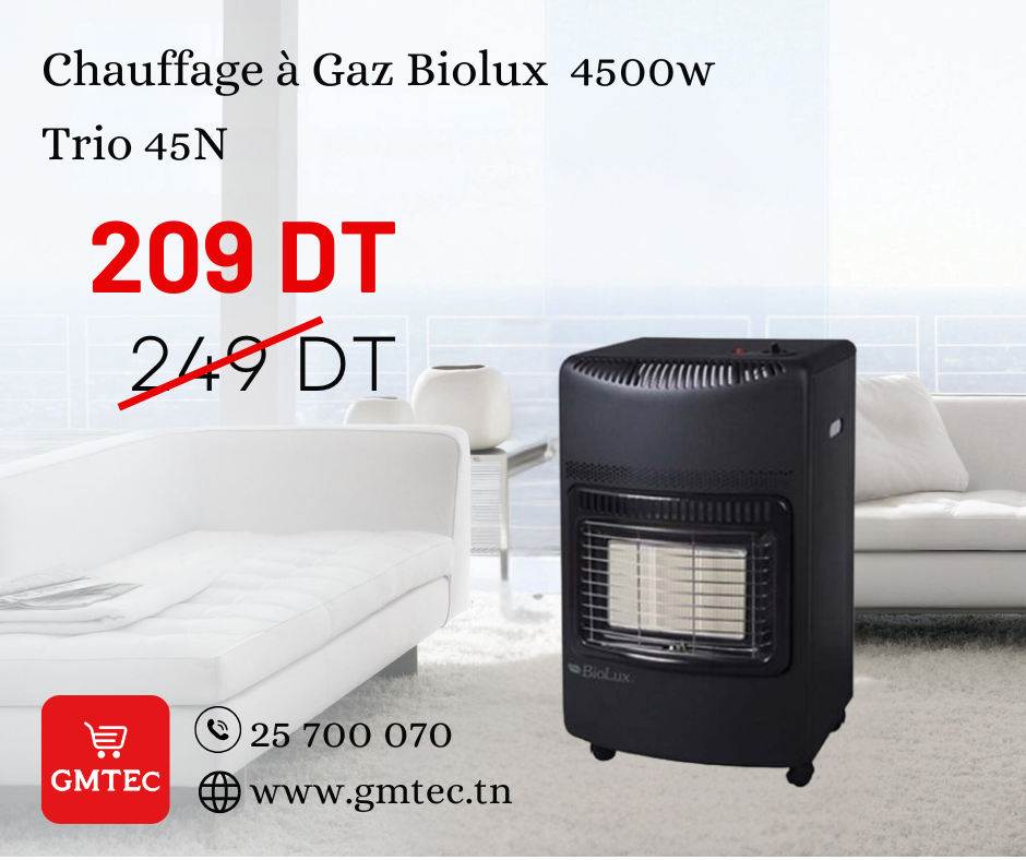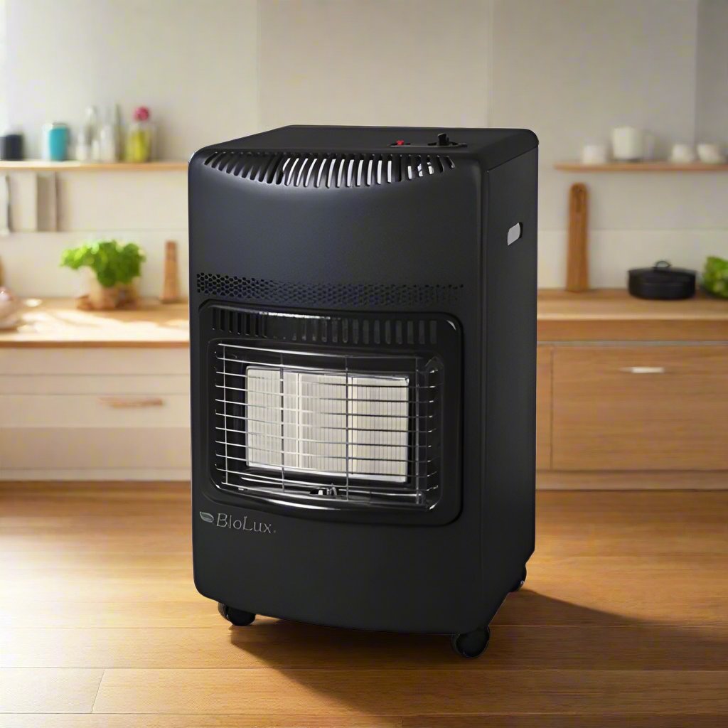 Chauffage à Gaz BIOLUX - Puissance: 4500Watts - Pression de gaz fonctionnante: 28mbar - Peinture électrostatique - Consommation économique - Allumage piezo électrique - Bruleur Céramique avec infrarouge - Trio-système : système thermo-couple , système désodorisant , système anti-flammes - Design élégant - Facile à déplacer - Dimensions: LxPxH : 42 x 37 x 74.5 cm - Couleur: Noir - Garantie: 1 an