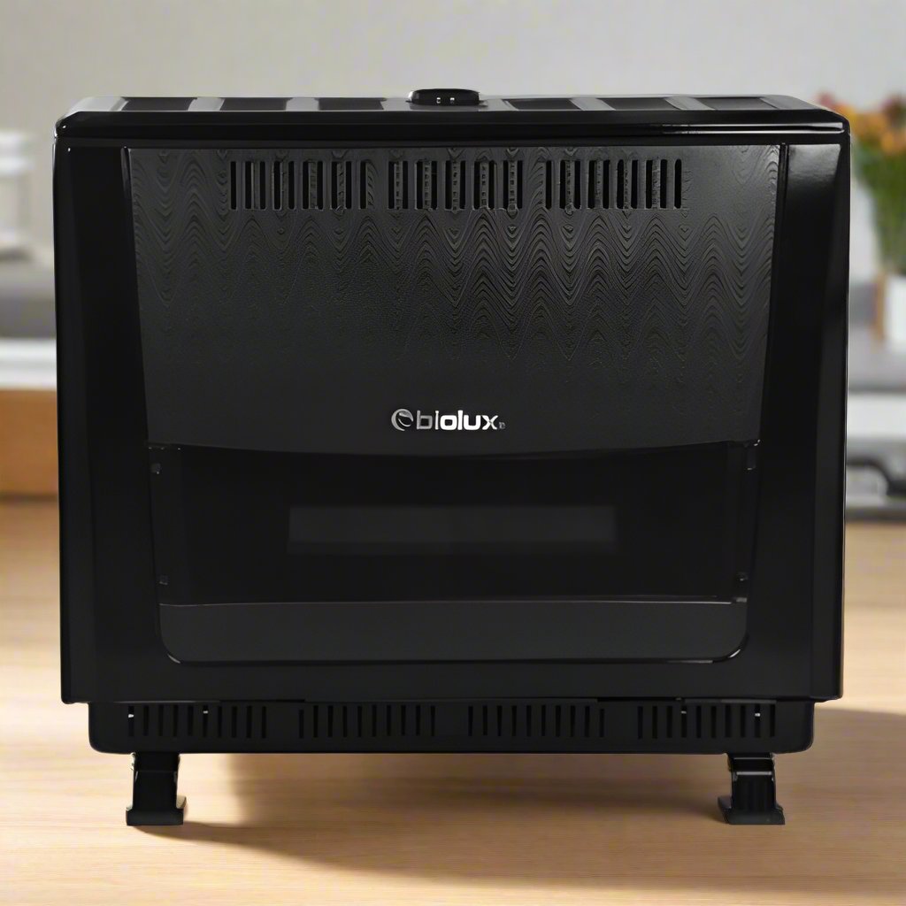 Chauffage A Gaz Naturel BIOLUX - Puissance: 14 KW - Volume à chauffer: 150-180 M3 - Pression du gaz: 18.5-20 - Diamètre de cheminée: 80mm - Thermostat réglable - Thermocouple - Revêtement: Tôle émaillée - Flammes: Acier inoxydable - Anti retour gaz brule - Ouverture pour allumage manuel - Sécurité atmosphérique - Double vitrage: verre échange + verre de protection - Allumage: Piézoélectrique - Dimensions: 83.5 x 30.5 x 81 cm - Couleur: Noir - Garantie: 1an