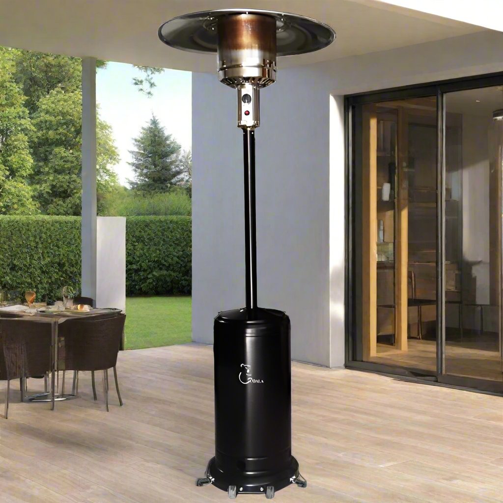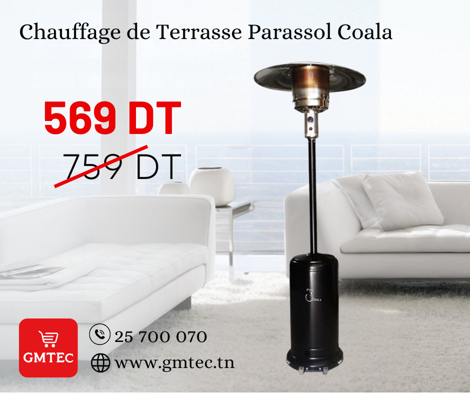 Chauffage de Terrasse Parasol COALA - Chauffage 2en1 alliant éclairage et chauffage - Puissance de flamme réglable - Puissance: Réglable de 5 à 12.5k Watts - Réflecteur: Ø 81.5 cm en 4 pièces, en aluminium - Flux: 450 à 945 g/heure - Autonomie: 15 h à 35 h selon la puissance utilisée - Base: Dia.460mm x 86(H) mm - Hauteur Totale: 2210 mm (H) - Carburant: Gaz propane ou butane - Porte d’accès en façade - Thermocouple - Grille de protection en acier - Dimensions: 880 x 460 x 460 cm - Couleur: Noir - Garantie: 1an