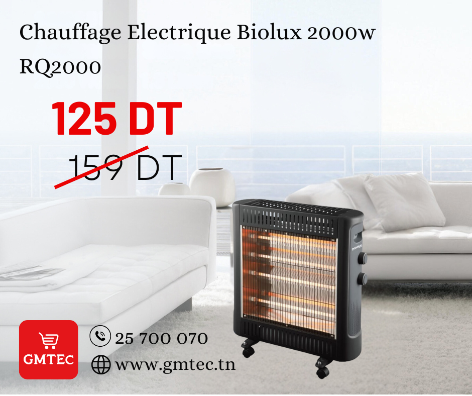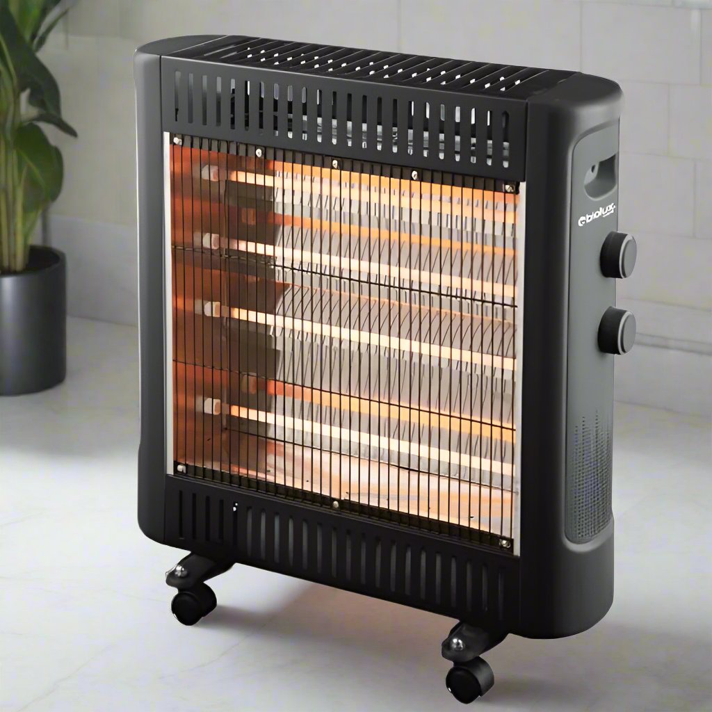 Chauffage Électrique BIOLUX - Fonctionne sur 2 niveaux de puissance différents: 1000Watts/2000Watts - Thermostat réglable - 4 Tubes - Faible consommation d'énergie - Sécurité anti-basculement - Avec Roulettes de transport pour faciliter le déplacement - Dimensions: 52 x 24.5 x 54 cm - Couleur: Noir - Garantie: 1an