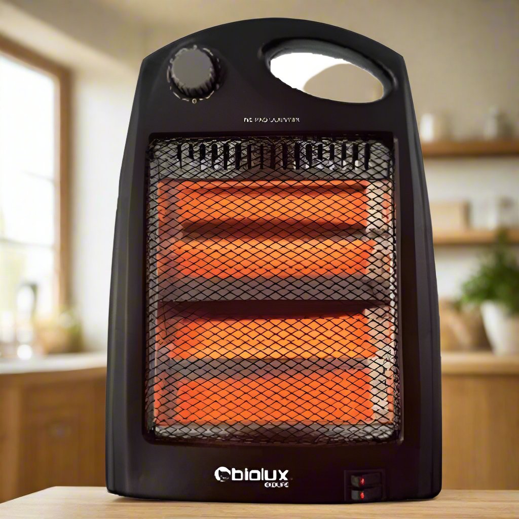 Chauffage Électrique BIOLUX - Fonctionne sur 2 niveaux de puissance différents: 400Watts/800Watts - Thermostat réglable - 2 Tubes - Faible consommation d'énergie - Sécurité anti-basculement - Facile à déplacer - Echauffement Rapide - Dimensions: 18 x 14 x 25.5 cm - Couleur: Noir - Garantie: 1an