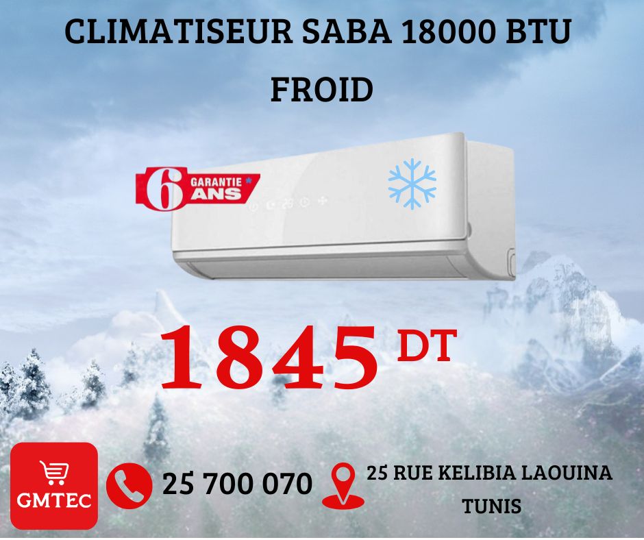 Climatiseur SABA - Puissance: 18000 BTU - Mode: Froid -Intensité de démarrage: 8.3A - Puissance absorbée: 1740W - Débit d'air : 800 m³/h - Niveau de bruit: 50 dB(A) - Tension d'alimentation : 220-240V -Fréquence : 50Hz - -Surface recommandée : 40 à 60 m² -Classe énergétique : Classe 3 - Design : Moderne et élégant- Garantie: 3 ans(6 ans de garantie sur le compresseur)