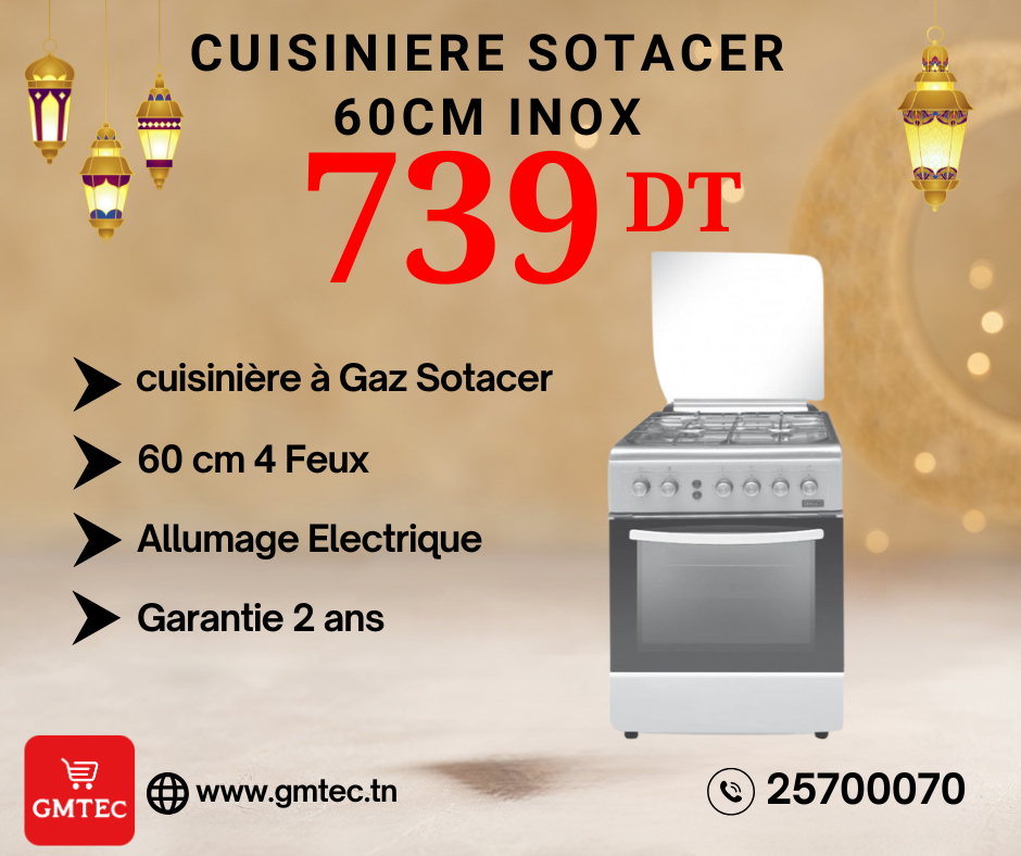 Cuisinière SOTACER - Type de cuisinière: à gaz - Nombre de Feux: 4 feux - Largeur: 60 cm - Allumage électrique - Eclairage four - Grilloir - Couvercle en verre - Couleur: Inox - Garantie: 2 ans