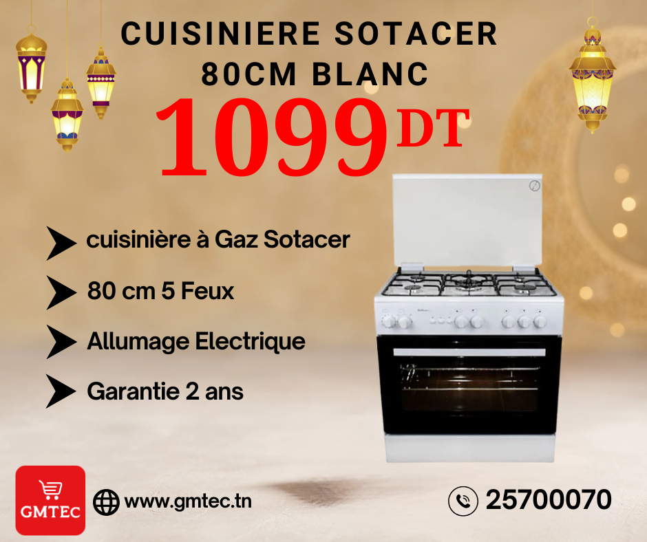 CUISINIERE A GAZ SOTACER 5FEUX 80CM BLANC SF8500WI