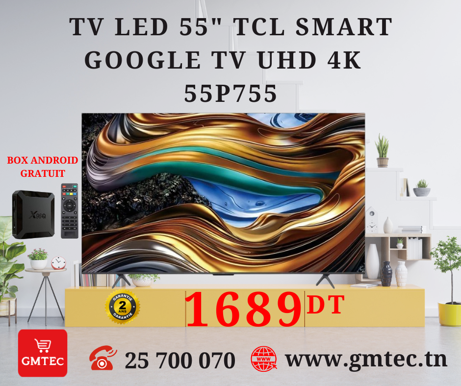 Tv TCL 55" P755 4K UHD - Résolution : 3840 x 2160 pixels - Système d'exploitation : Google TV - Dolby Vision - Dolby Atmos, DTS Virtual-X - HLG - HDR 10+ - Design élégant sans cadre - Puissance sonore : 2 x 15W - Accélérateur de jeu 120 Hz - Maître du jeu 3.0 - Assistant Google mains libres - Google Home, Alexa Smart Home - Miracast, Chromecast · Netflix, Amazon Prime, Disney - Connectivité : Wi-Fi, Bluetooth 5.0 - Connecteurs : 3xHDMI , USB 2.0 - Dimensions : 1226 x 750 x 255 mm - Garantie : 2 ans