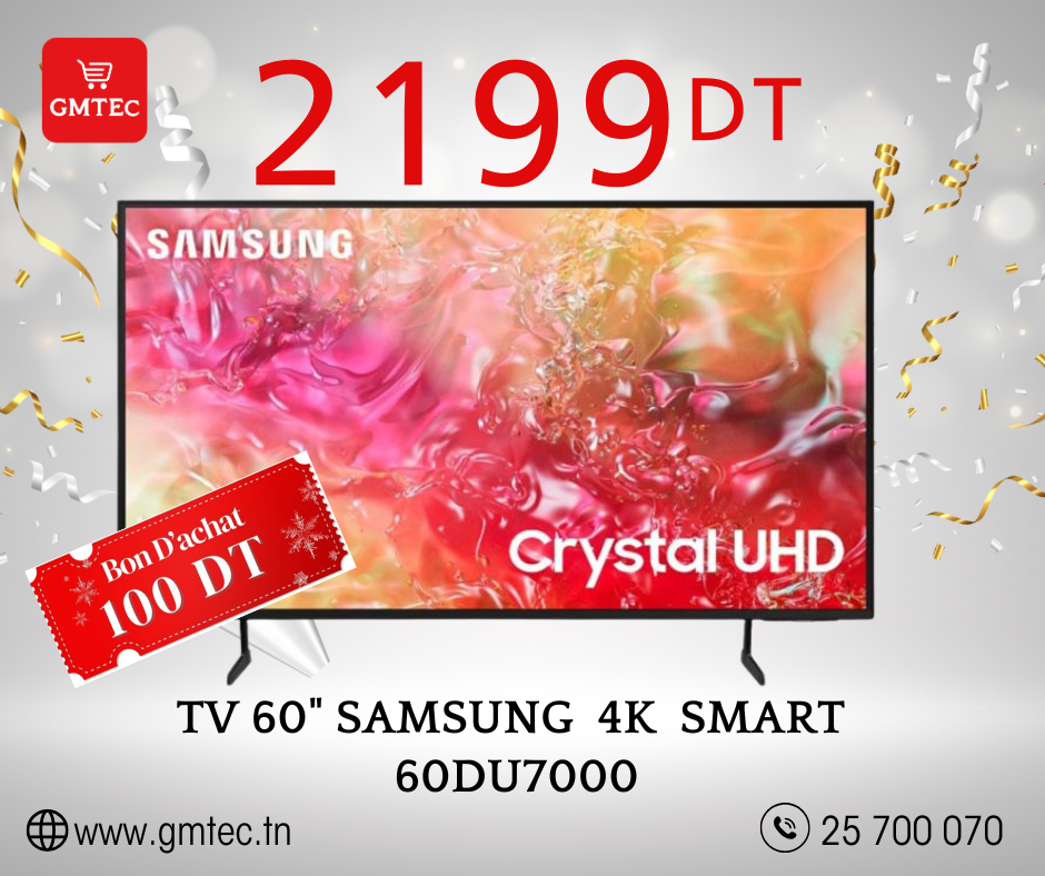 Tv SAMSUNG 60'' Smart DU7000 Crystal Ultra HD 4K - Récepteur Intégré - Résolution: 3840x2160 pixels - Haut de gamme de l'image 4K - Processeur Crystal 4K - Méga contraste - HDR 10+/HDR - UHD Dimming - Son Adaptatif - Motion xcelerator - Object Tracking Sound (OTS Lite) - Q-Symphony (Tv, Barre de son orchestrés en harmonie) - Auto Game Mode - HGIG (Game) - Mode film - Mobile vers TV - Miroitage Son -TV Sans Fil allumée - Smart things, Smart Hub, IoT-sensor funtionality - Connectivité: Wi-Fi 5, Bluetooth - Design slim cook - Connecteurs: 3xHDMI ( 4K 60HZ pour HDMI ), 1xUSB - Dimensions: 1355.0 x 824.4 x 267.4 mm - Garantie: 2ans