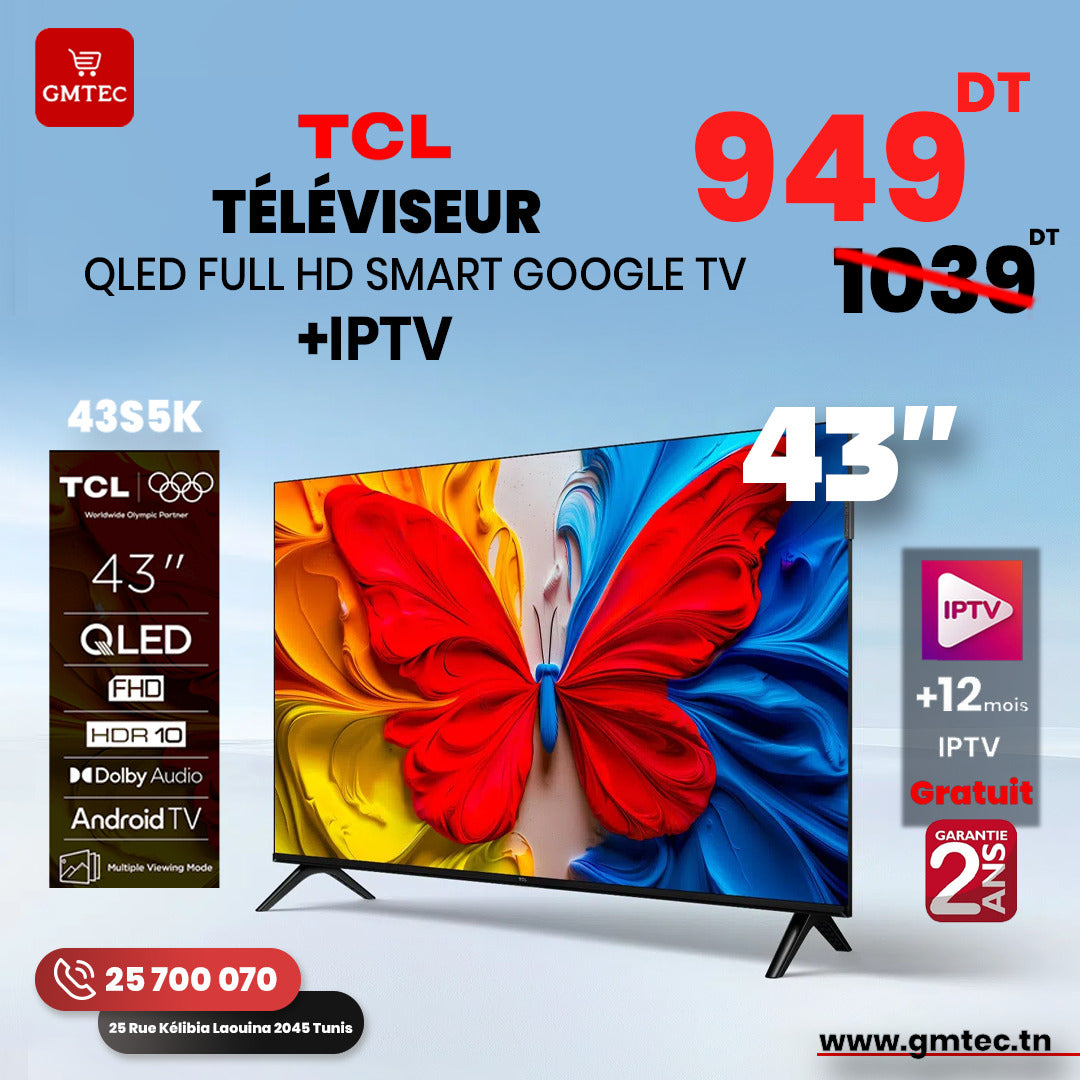 TV QLED TCL 43" FULL HD SMART GOOGLE TV 43S5K- 2 ANS GARANTIE