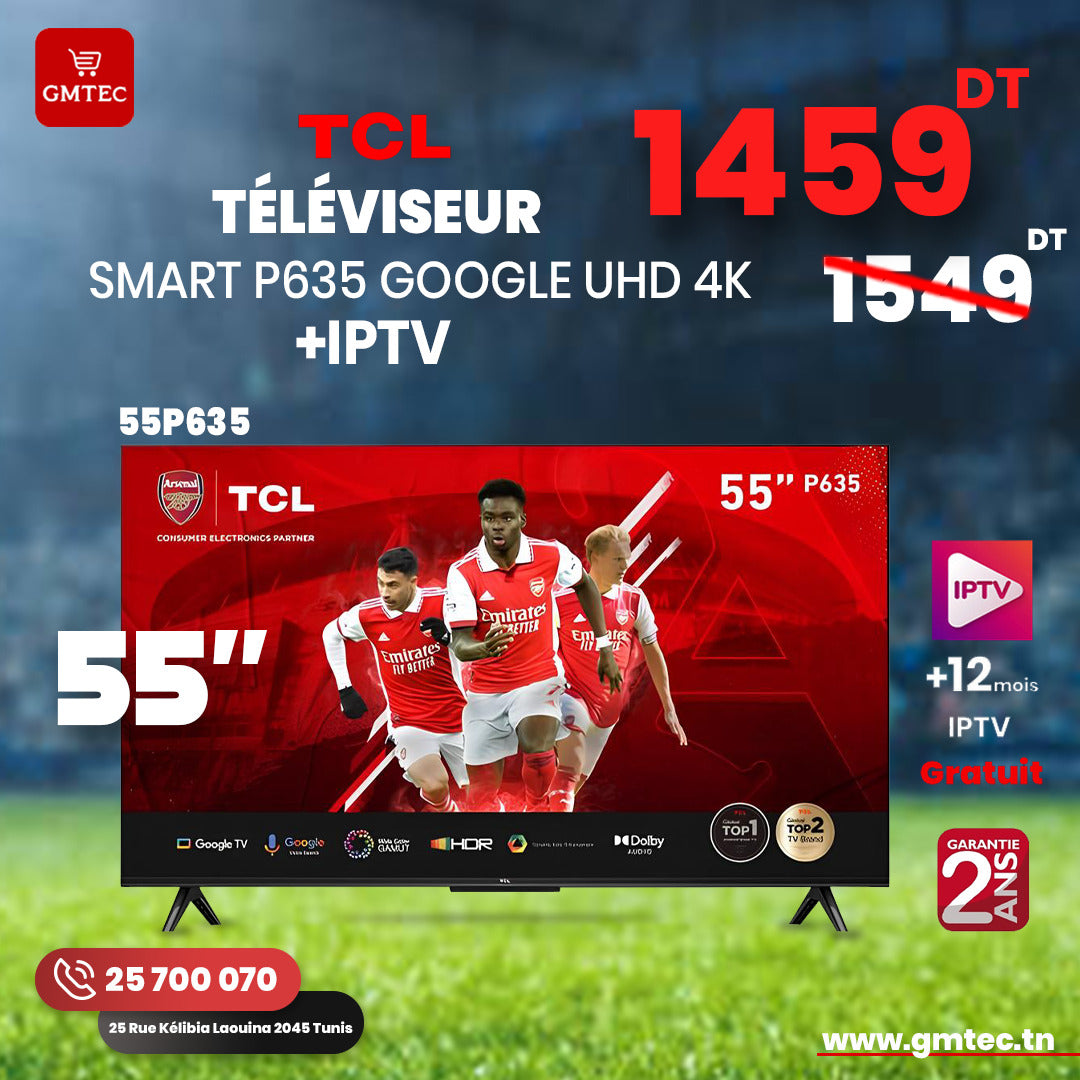 Tv TCL 55" P635 4K UHD - Résolution : 3840 x 2160 pixels - Processeur : G31MP2 800MHz 32 bits A55×4 1,3 GHz - Rapport d'aspect : 16:09 - Son Dolby - Audio Bluetooth - HLG - HDR 10 - Design Premium et élégant sans cadre - Puissance sonore : 2 x 10W - Commande vocale OK Google , Alexa - Communication vidéo Google Duo - Connectivité : Wi-Fi 2.4G/5G, Bluetooth 5.0 - Classe énergie : E/G (HDR) - Connecteurs : HDMI 2.1, USB 2.0, RF - Garantie : 2 ans